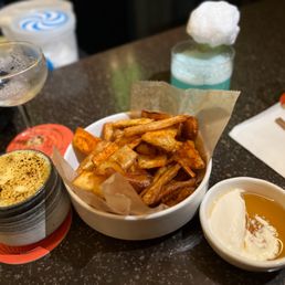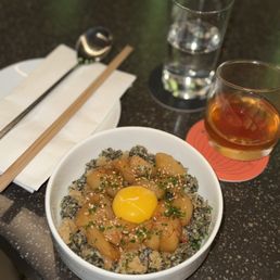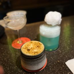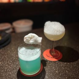 Seoul Salon- a relatively newish spot in ktown with insane cocktails! I've been here twice, once at the bar (5/5), and once in the dining room for drinks and snacks (3.5/5). Bar review: The bar seating has exclusive drinks that are insane- definitely recommend trying to sit at the bar. I came with a friend and got the Hangang Blues which had both blue cheese and blue curaçao (very blue), and was served with cotton candy. My friend got a more herbal drink, very good as well (cannot remember the name :(( The bartenders are super friendly and chatty, definitely ask for recommendations! 5/5 stars. Dining Room: The dining room offers food and a smaller selection of drinks which are fine, but definitely not the show-stoppers of the bar. I came with a different friend and got the Pine Nut Salad and Banana Milk Shaved Ice. I also got the Moon Highball (banana milkis foam aged soju highball- fine), and my friend got the Nurunji Martini (strong and spirit forward (as a martini is), but with a nice subtle burnt rice taste and scent- better than mine). The salad was fine, but the Banana Milk Shaved Ice was my favorite bite. It was icy (as opposed to milky) but had banana and orange cream interspersed which made it super creamy and delectable. Service in the dining room is a bit slow, was hard to get a waiter but it was a Friday night. 3.5/5 Overall, this is a nice addition to the ktown restaurant/bars! I'd come back to sit at the bar for sure, and might come back for dinner as well (but will come when it's less busy!).