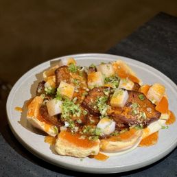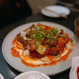 Saw this place on social media and it definitely did not disappoint! We got the soy scallops as recommended, which was by far my favorite dish of the night. The scallops were fresh and light, yet savory with soy and egg yolk. We also got the spicy raw crab noodles. It seems like you're supposed to mix the crab and noodles together but I actually preferred to eat them separate as you can better taste each. Next we had the grilled tteokgalbi, which was husband's fave but my least favorite. The flavor was good but it resembled a burger patty which took me by surprise! We also got the corn cheese spicy jokbal which were pork trotters smothered in corn and melted cheese in a spicy sauce. This was so good and flavorful but the spice is definitely not for the weak! Service was so good and our waitress was super nice and helpful. Would highly recommend and would definitely go back!